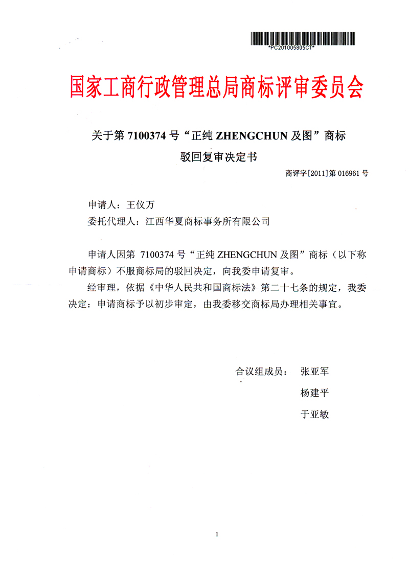 關(guān)于“正純及圖”商標駁回復(fù)審決