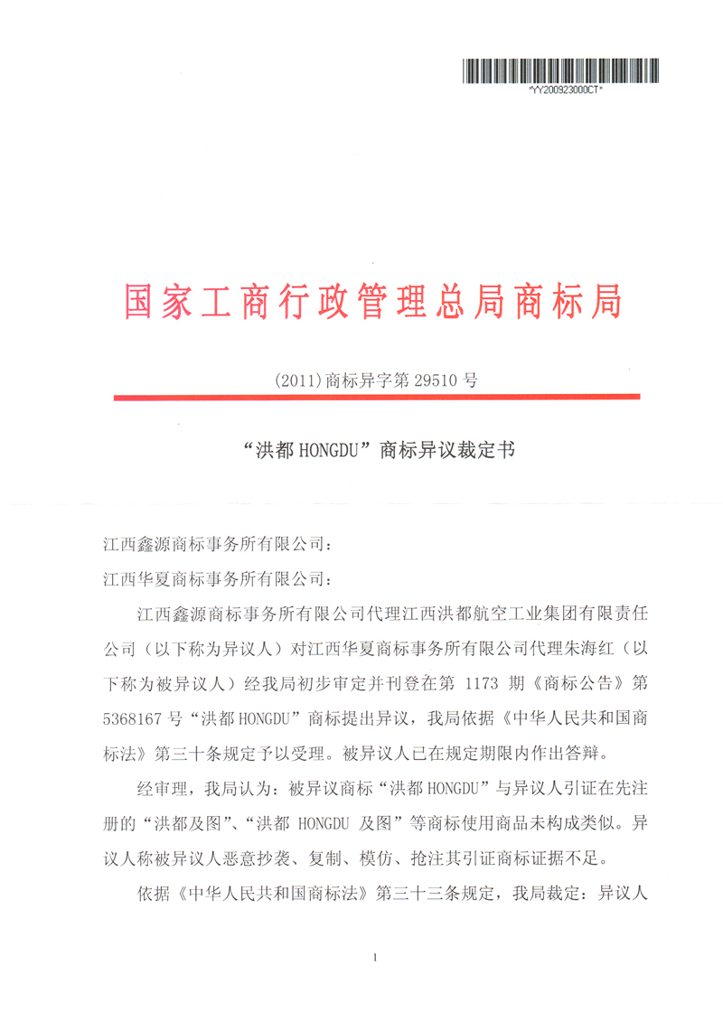 “洪都”商標異議裁定書