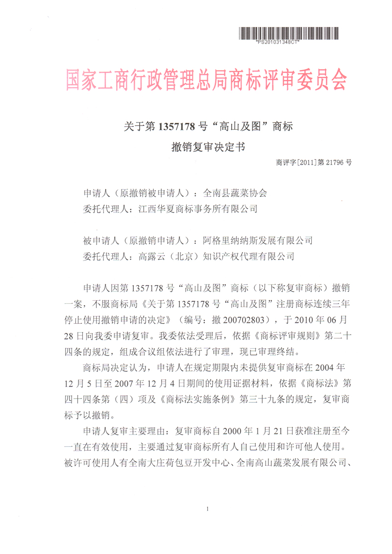 關(guān)于“高山及圖”商標撤銷復(fù)審決